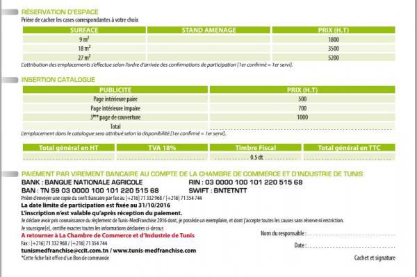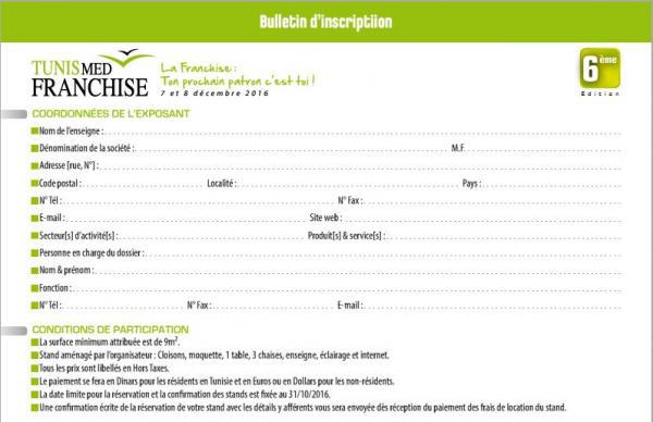 La Chambre de Commerce et d’Industrie de Tunis et l’Association Tunisienne de la Franchise (ATF) annoncent la tenue de la 6ème édition du Salon Tunis-Medfranchise les 7 et 8 Décembre 2016 au siège de l’UTICA sous le slogan : «Ton prochain Patron, c’est toi !».
