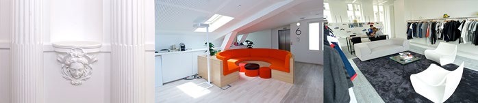 Certaines parties du bâtiment étant classées, se marient moulures et modernité d’un mobilier minimaliste ou recyclé, partiellement conçu en France. Les sociétés JLL, Majorelle et Tétris ont été les partenaires d’adidas France pour la conception et l’aménagement de ses nouveaux bureaux.