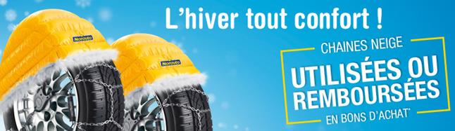 Norauto renouvelle son offre « Chaînes neige utilisées ou remboursées », du 25 janvier au 6 mars. Ainsi, en cas de non utilisation des chaînes neige achetées dans l’un des établissements Norauto ou sur le site de vente en ligne, le client pourra être remboursé dans les 30 jours suivant leur achat (produit non utilisé et dans son emballage d’origine, remboursement sous forme d’avoir ).