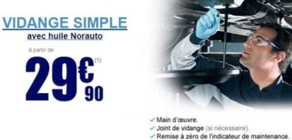 Les centres Norauto proposent la vidange simple avec huile Norauto 15w40, à partir de 29.90 €. Cette offre comprend la main d’oeuvre, le joint de vidange (si nécessaire) et la remise à zéro de l’indicateur de maintenance. Le filtre à huile et le remplacement du filtre à huile ne sont pas inclus. Pour profiter de cette prestation, les clients devront prendre rendez-vous.
