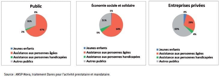 La France, en comparaison avec les autres pays européens, connaît un poids très important de l’emploi direct et un recours encore faible aux entreprises qui ont donc UN FORT POTENTIEL DE CROISSANCE car leur venue sur le marché est encore récente avec les lois Borloo comparée à d’autres pays. On retrouve aussi dans le secteur, des structures publiques et associatives à but non lucratif.