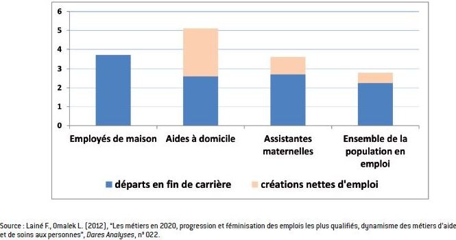 D’après les projections réalisées dans le cadre du groupe de travail sur la dépendance en 2011, le nombre de personnes âgées dépendantes devrait augmenter de 35 % d’ici 2030. D’autre part, des créations d’emploi pour les assistantes maternelles devraient également être créés en vue de la poursuite d’une natalité élevée et du développement de l’activité féminine.