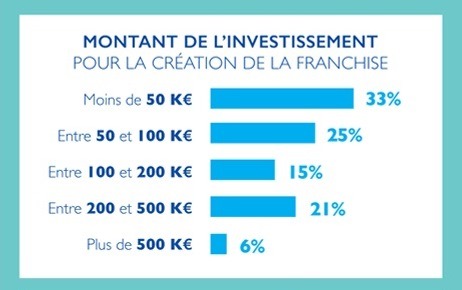 En moyenne, un investissement de 57 K€ euros est nécessaire pour l’installation en franchise. Cependant, cet investissement est sensiblement supérieur pour la création d’une activité de commerce (212 K€) que pour une activité de services (123 K€). Notons, par ailleurs, que pour près de 6 franchisés sur 10, le coût de création de l’entreprise en franchise est inférieur à 100 K€. Toujours selon l’enquête, 60% des franchisés en activité depuis plus de 5 ans ont réalisé des investissements au cours des 2 dernières années, voire 81% des franchisés employant plus de 10 salariés, ce qui prouve la bonne santé des franchisés.
