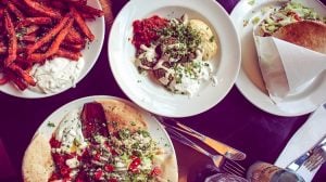 Salades, meze, falafel, etc. à consommer aussi sur place dans les restaurants équipés de places assises.