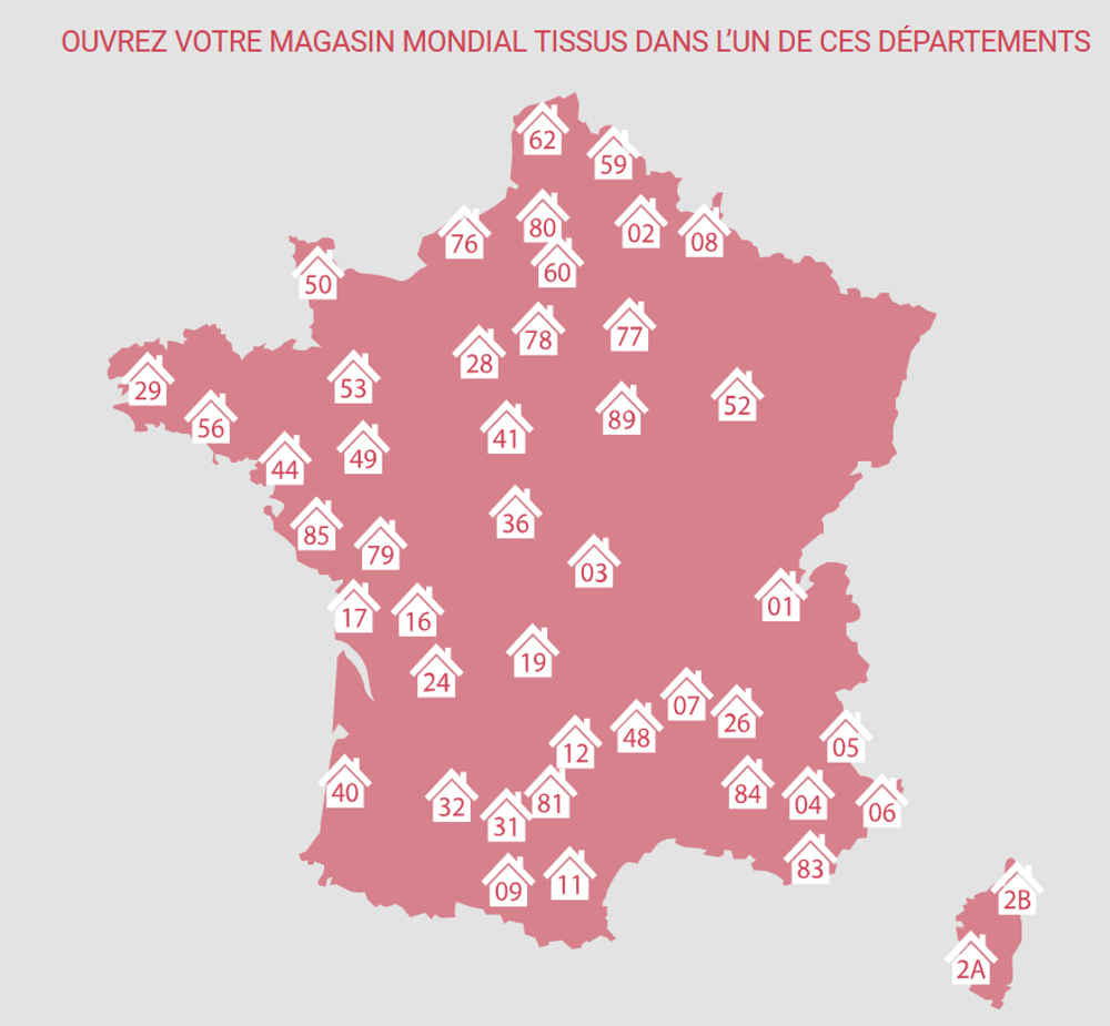 La franchise Mondial Tissus est actuellement à la recherche de nouveaux partenaires pour poursuivre son maillage territorial. L’enseigne propose de belles opportunités d’implantation dans diverses régions de France. A noter que toutes les villes belges sont disponibles pour l’instant.