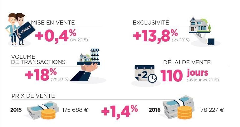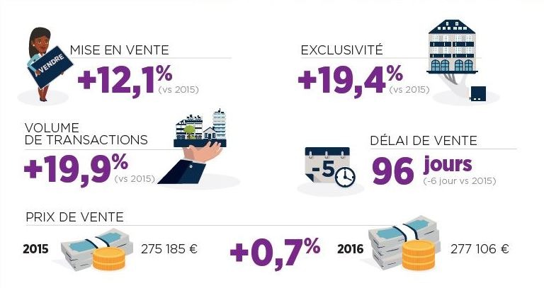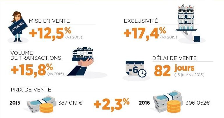 En 2016, le prix moyen des biens vendus s’est établi à 210 045 € pour la France entière, avec un pic à 396 052 € pour la capitale.