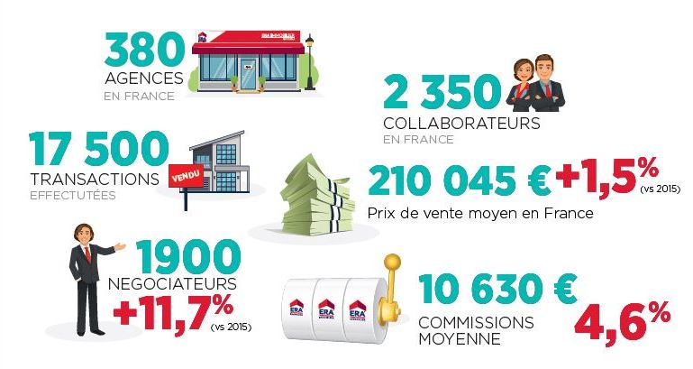 Le réseau ERA Immobilier compte actuellement 380 agences en France et 2 350 collaborateurs. En 2016, 17 500 transactions ont été effectuées.