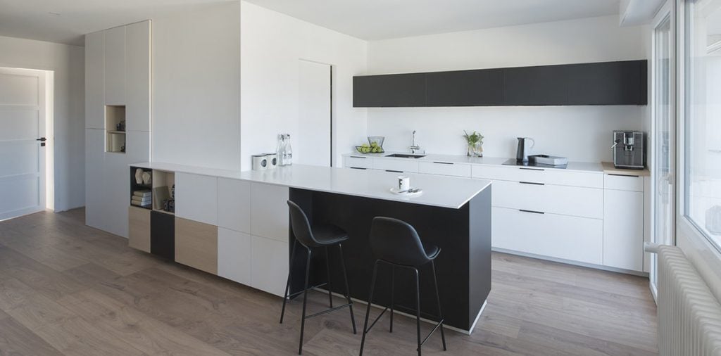 L’appartement étant encore en travaux, la surface de la cuisine a pu être adaptée par rapport aux plans techniques proposés, résultat: la cloison de la chambre a pu être réalisée sur mesure pour un fini parfaitement harmonieux. Il a aussi été possible de réaliser un grand cellier/buanderie très fonctionnel (contenant le four et le frigo), prolongé par un placard côté entrée et des niches côté salon.