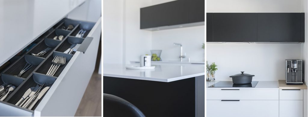 L’équipe Mobalpa a également conçu des armoires de rangement sur mesure face à l’entrée de l’appartement, avec des portes toute hauteur très élégantes et sobres. Les meubles living dans les mêmes coloris ont également été ajoutés pour une cuisine parfaitement intégrée au reste du salon.