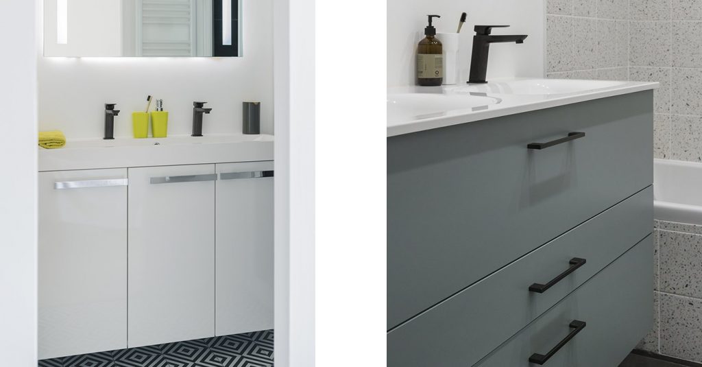 Bien que Frédéric et Florence voulaient une cuisine noire, la conceptrice Mobalpa leur a aussi conseillé d’ajouter du blanc, pour renforcer les lignes épurées ; puis de réchauffer le tout par une touche de bois couleur chêne de Bourgogne.