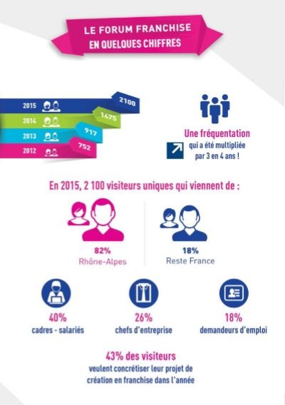 - 2 500 porteurs de projet intéressés par le modèle de la franchise pour créer ou reprendre une entreprise, « 43% des visiteurs souhaitent concrétiser leur projet de création en franchise dans l’année » selon l’enquête visiteurs Forum Franchise 2015