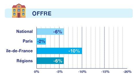 L’offre poursuit son recul : Face à la forte demande, l’offre continue son recul au 1er semestre 2019. Les grandes métropoles et les villes les plus dynamiques sont concernées par ce recul. Cela s’explique par le fait que les propriétaires dans ces villes n’accélèrent pas les mises en vente, malgré des prix qui progressent encore, car ils désirent trouver un futur logement avant de mettre en vente l’actuel. Par ailleurs, en raison d’un marché ultra dynamique en Ile-de-France et 3 ans de records battus en termes de volumes de transaction, notamment la 1ère couronne, les stocks sont au plus bas. Dans ce contexte, les mises en vente ne suffisent plus à alimenter l’offre, créant une pénurie croissante dans de nombreuses communes.