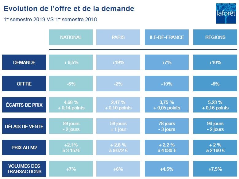 Yann Jéhanno, Président de Laforêt, a déclaré à ce sujet: « La comparaison entre les résultats du 1er semestre 2019 et celui de 2018 prouve que le marché de l’immobilier ancien poursuit sur la lancée engagée depuis 2016… Alors que le marché s’attendait à vivre un 2e trimestre plus calme, le rythme des transactions s’est accéléré par rapport à 2018… Et, si cette dynamique se poursuit sur le 2nd semestre, ce qui est envisageable, il y a de fortes probabilités pour que l’année 2019 établisse de nouveaux records, que ce soit en termes de prix ou de volumes ! ». Les volumes de transactions s’accélèrent : Au niveau des volumes des transactions, on décèle une accélération, portée par l’envie des français d’acquérir un bien en profitant de taux d’intérêt très attractifs et les banques qui n’hésitent plus à allonger leur durée de prêts. On remarque également une progression des ventes dans les campagnes les plus reculées où l’offre est restée relativement dense et où les prix sont désormais stabilisés. Si les primo-accédants décident d’acquérir avec des budgets inférieurs ou égaux à 100 000 euros, les Français résidant en location dans les grandes agglomérations et qui ne peuvent pas accéder à la propriété dans leur ville ou leur quartier, quant à eux, optent pour l’investissement locatif en périphérie, pour se créer un patrimoine immobilier.