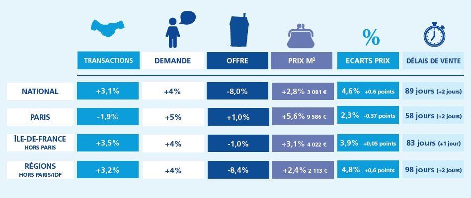 - Les transactions qui progressent de 3.1 %, boostées par les résultats du dernier trimestre du fait du grand nombre de français qui ont souhaité concrétiser leurs projets immobiliers