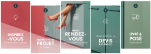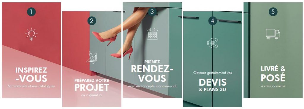 1- S’inspirer Mobalpa met à la disposition de ses clients un large choix de modèles de cuisine afin de les inspirer et les aider à choisir les caractéristiques de leur nouvelle cuisine. Ils peuvent également s’inspirer grâce aux dossiers thématiques et reportages disponibles en ligne. 2- Préparer son projet L’enseigne propose à ses clients de créer leur espace projet en ligne afin de pouvoir préparer et suivre son évolution jusqu’à sa réalisation, tranquillement, depuis chez eux. Chacun peut se projeter grâce à l’outil « inspiration » et imaginer l’ambiance qui lui correspond mais aussi épingler tous ses coups de cœur afin de pouvoir les retrouver facilement, par la suite. 3- Prendre rendez-vous Le client peut choisir le créneau de 2h qui lui convient le mieux pour être reçu par un concepteur au savoir-faire unique. Le concepteur est là pour mieux appréhender les attentes du client. Expert en conception, décoration et conseil, il esquisse différentes implantations et établit avec lui toutes les solutions d’aménagement possibles en tenant compte de ses contraintes ergonomiques, esthétiques et techniques.