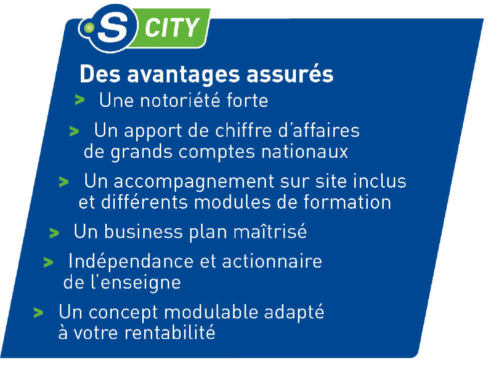 - Format misant sur la proximité, Point S City est idéal pour une diversification d’activité et est très prisé par les patrons de carrosseries, garages automobiles, stations services, centres de contrôle technique… Accessible avec un faible investissement, ce format a démontré son efficacité : notoriété, accompagnement du franchiseur, etc.