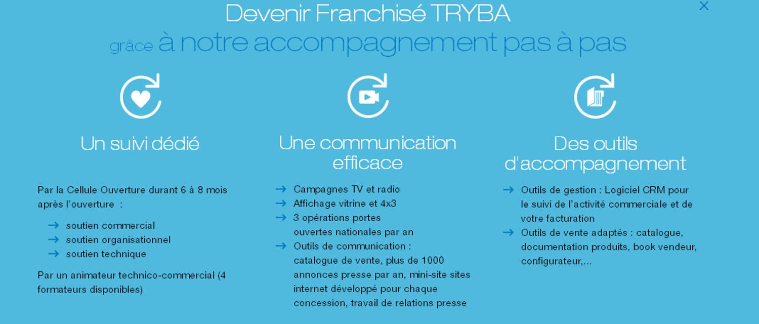 Tryba multiplie d’ailleurs les actions de soutien à ce réseau qu’elle ambitionne de faire développer pour atteindre 400 points de vente d’ici 4 ans. De l’accompagnement à l’ouverture (aide à la prospection du local et courts délais de réalisation du projet) aux campagnes de communication (tv et radio, 3 opérations portes ouvertes par an…) en passant par la mise en place d’outils performants (gestion et vente), l’enseigne est activement présente auprès de ses adhérents.