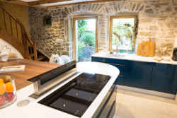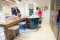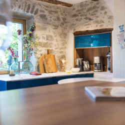 Leurs sources d’inspiration : « Amateurs de voyage et de randonnée, nous aimons les rencontres et le partage. D’où notre choix d’un îlot central avec une grande table, espace idéal en toute occasion – petit-déjeuner, préparation des repas, jeux avec notre petite-fille, apéritif entre amis… Le modèle coloré apporte ce qu’il faut de modernité et de bonne humeur, tout en créant un contraste harmonieux avec le style rustique de la maison. »