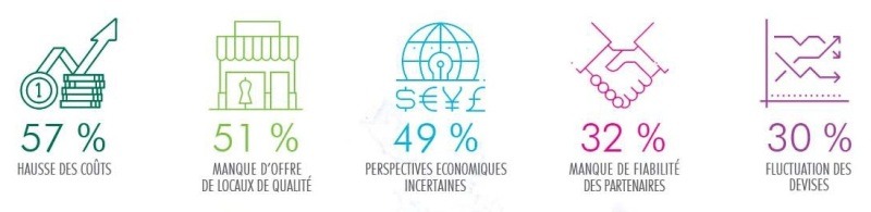 Plus de la moitié des enseignes interrogées (57 %) indiquent que la hausse des coûts est l’un des principaux freins qui pourrait peser sur leurs plans de développement cette année. Autres inquiétudes des enseignes pour 2017, le manque d’offre prime pour 51 % et les incertitudes économiques pour 49 %.