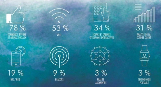 Pour ce qui est des réseaux sociaux, ils font désormais partie intégrante de la politique de développement des enseignes puisque 78 % des sondés déclarent qu’ils les utilisent déjà dans leurs boutiques ou le feront à court terme, devant l’accès au Wi-Fi (53 %) et les écrans interactifs (34 %). Les nouvelles technologies sont devenues indispensables, que ce soit pour la vente en ligne ou la vente en boutiques car elles permettent de mieux connaître et d’analyser les comportements des clients pour toujours mieux répondre à leurs besoins.