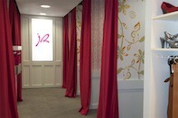 des cabines d’essayage décorées de papier peint et drapées de rouge, un sol de bois clair, des murs taupes et fuchsia, des couleurs très tendance complétées par des touches bleu pastel et jaune soleil L’espace ainsi recomposé doit être le messager d’un accueil qui se veut personnalisé, convivial mais aussi ouvert à toutes. En effet,