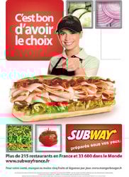 Les spots Tv mettront en avant l’atout de la franchise de fast food, à savoir que les sandwiches sont préparés à la commande, sous les yeux des clients, et en respectant leur choix d’ingrédients variés. Les spots publicitaires seront en fait un sorte de « saga » à suivre, et ayant pour thème récurent « Subway, c’est bon d’avoir le choix).