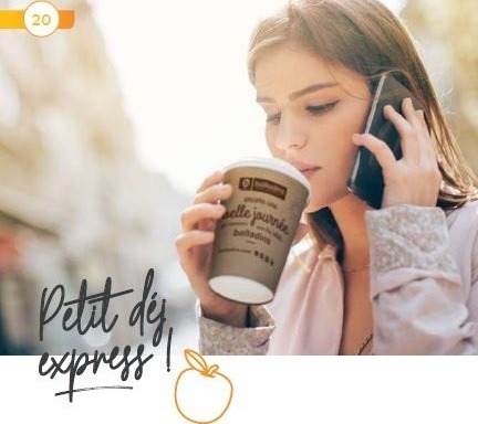 - Offre Petit-Déj’ Express: pour des montants compris entre 3 € et 5 €, un sac kraft contenant, à la guise du client et selon ce que proposent les hôteliers, une boisson chaude, une viennoiserie, des fruits frais, une compote…