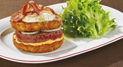 Burger « Le Montagnard »: un steak haché assorti d’une crème ciboulette sur un pain toasté croustillant. Une galette de pommes de terre, du bacon et des oignons rouges alliés au reblochon et à la roquette.