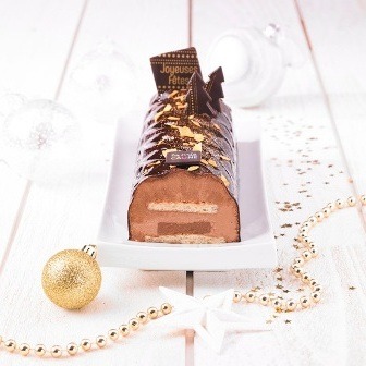 - La Bûche Royale, un classique revisité: composée d’un biscuit succès, d’une mousse chocolat noir et d’un croustillant chocolat noisette recouvert d’un miroir chocolat noir.