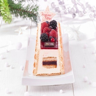 - La Bûche Tiramisu fruits rouges : à la façon tiramisu, une bûche faite de la superposition de biscuits cuillères, de crème au mascarpone et d’un coeur fruits rouge (mûres, groseilles, myrtilles, framboises)