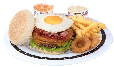 - Breakfast Burger : Un plat gourmand et complet alliant un burger original à base de pain muffin, de viande hachée de bœuf fraîche, d’un œuf à cheval, de cheddar, d’une galette de pommes de terre, de poitrine fumée, de salade et de ketchup, le tout accompagné par des crinkle fries.