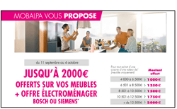 - Pour l’achat d’une cuisine Mobalpa d’un montant minimum de 4000 €, et selon un barème d’achat, le consommateur bénéficiera d’une réduction allant jusqu’à 2 000€ offerts sur ses meubles de cuisine.