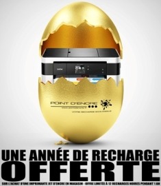 - A l’occasion des fêtes de Pâques, l’enseigne rappelait à ses clients l’année de recharge offerte pour l’achat d’une imprimante jet d’encre en magasin (Dans la limite de 12 recharges noires maximum pendant un an).
