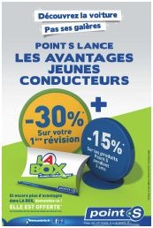 En se rendant dans l’un des 450 centres Point S les titulaires d’un permis de moins de 3 ans reçoivent gratuitement la Box Jeunes Conducteurs, qui leur permettra de bénéficier, pendant toute la période probatoire de leur permis, d’une remise de 30% sur leur première révision et de 15% sur les produits à la marque Point S, y compris les pneus.
