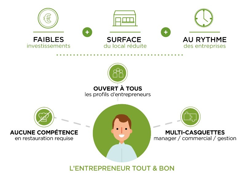 Le secteur de la restauration au sens général, bien que séduisant, restant souvent pour beaucoup de candidats à la franchise source de nombreuses contraintes: investissement de départ colossal, des horaires de travail denses et peu adaptés à une vie de famille… Tout & Bon affirme que son concept de restauration 100 % livrée en entreprise, ces contraintes n’ont plus lieu d’être.