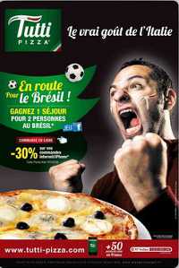 Tutti Pizza est une franchise de pizzas à emporter, implantée principalement à Toulouse et dans ses environs. L’enseigne compte actuellement 54 points de vente et souhaite se développer sur de nouvelles régions notamment en Bretagne et dans les Pays de la Loire. L’enseigne profite du grand jeu Tifosi qu’elle organise, pour annoncer une réduction de 30% sur chaque commande passée en ligne du 1er avril jusqu’au 15 juillet. L’enseigne leader dans le Sud-Ouest réveille la passion du foot chez les français. Un voyage au Brésil de 5 jours et 4 nuits est mis en jeu et c’est donc aux clients-supporters de jouer pour le gagner !