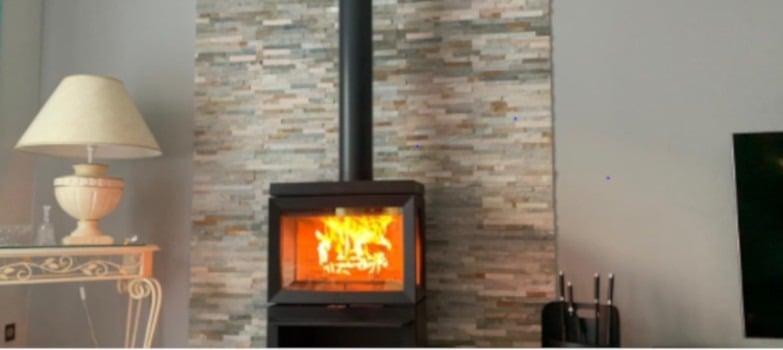 Cette élégante installation de son revendeur Cheminées Gironde Le Haillan qui habille l’arrière du poêle à bois Jøtul F 520 d’un somptueux parement en pierre. Un grand bravo !