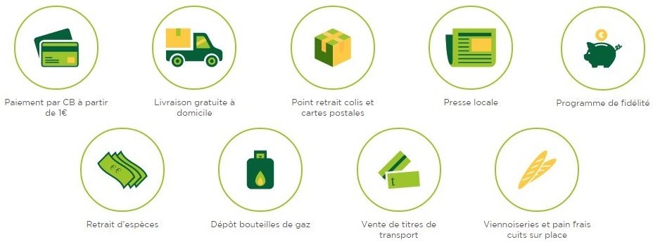 Une large gamme de services est également mise à disposition de la clientèle: paiement par cb à partir de 1€, livraison gratuite à domicile, point retrait colis et cartes postales, presse locale, retrait d’espèces, dépôt bouteilles de gaz, vente de titres de transport, viennoiseries et pain frais cuits sur place, programme de fidélité.