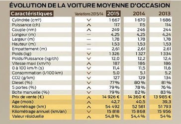 Selon cette enquête, la Voiture Moyenne d’Occasion des Français est âgée de 42,7 mois contre 40,5 en 2014 et 39.3 en 2103, diesel à 77 %, affiche 54 492 km au compteur contre 52 581 en 2014 et 51 793 en 2013 et une valeur résiduelle de 54,8%. Elle coûterait en moyenne 14 926 € contre 14 360 € en 2014 et 13 985 € en 2013. Quant à sa consommation, elle est de 5 l/100 km contre 5.1 l/100 km en 2014 et 5.2 l/100 km en 2013.