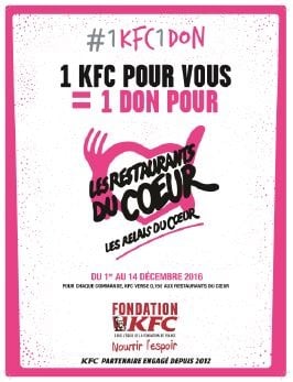 L’enseigne KFC et la Fondation KFC, sous l’égide de la Fondation de France, lancent une campagne de collecte de fonds pour les Restaurants du Coeur: 1 KFC pour vous = 1 don pour les Restaurants du Coeur.
