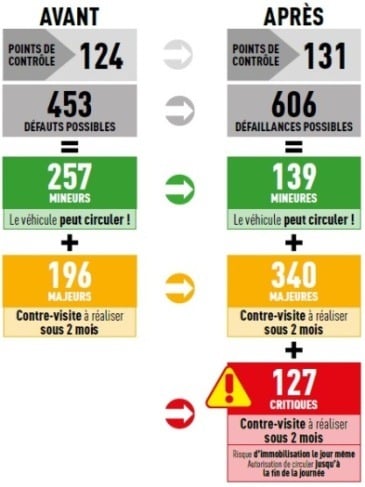 A partir du 20 mai 2018, les défaillances possibles passeront de 453 actuellement à 606 et les défaillances « majeures » augmenteront également pour passer des 196 actuelles à 340. Un nouveau niveau de défaillance dit « critique » a été ajouté.