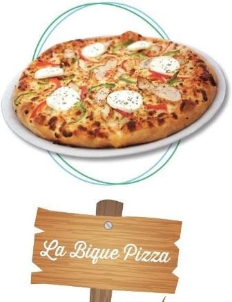 La Bique Pizza est faite avec: base tomate, mozzarella, lamelles de poulet rôti, poivrons, rondelles de fromage de chèvre Soignon et origan.