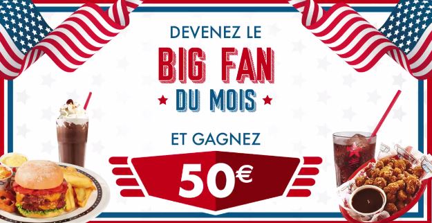 La personne étant élue Big Fan du mois se verra offrir un chèque cadeau de 50 € qu’elle pourra utiliser dans un restaurant Memphis de son choix. Ce chèque est valable 3 mois à partir de son envoi.