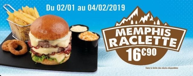 Burger en édition limitée, Colorado Memphis Raclette est disponible dans les restaurants du réseau depuis Le 2 janvier et le restera jusqu’au 4 février. Il est vendu au prix de 16.9 € (prix national conseillé).
