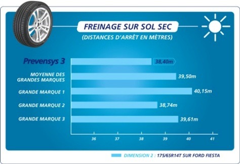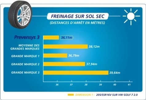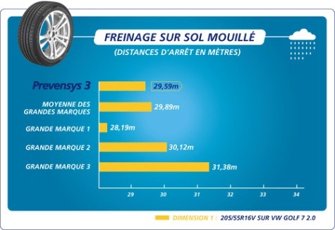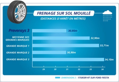 Le pneu été Prevensys 3 permet de gagner jusqu’à 2 mètres au freinage sur sol mouillé. Cela vaut au pneu Prevensys 3 le labelling le plus élevé, noté A, sur le freinage en sol mouillé, pour 13 de ses dimensions, dont le 205/55R16 91V, monte n°1 du marché.