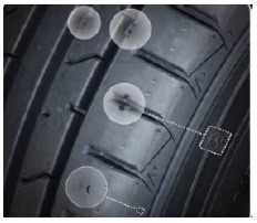 - Trois témoins qui facilitent la vérification du niveau d’usure de la gomme du pneumatique, avec double témoin d’usure et un témoin de géométrie, pour repérer tout défaut de parallélisme