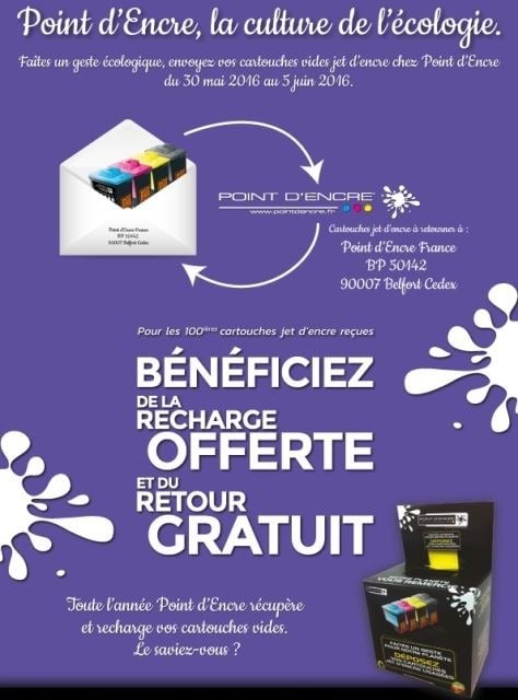 Cette année encore, Point d’Encre s’associe à la semaine européenne du développement durable et propose à ses clients d’envoyer leurs cartouches vides jet d’encre pour bénéficier de la recharge offerte. Cette offre sera valable durant la semaine du 30 mai au 5 juin.
