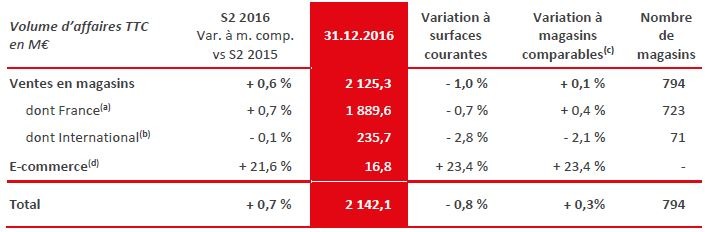 Les acquisitions de 2 magasins menées au 1er semestre et les opérations de déstockage ont contribué au chiffre d’affaires consolidé du second semestre 2016 des magasins intégrés. Sur l’exercice, il s’établit à 331.7 M€ (- 0.3 % à surfaces courantes et – 2.7 % à magasins comparables).