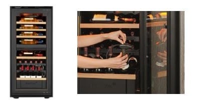 - La cave 2 températures, format M uniquement, pour la conservation des vins rouges et vins blancs, à température idéale de dégustation, dans deux compartiments séparés. La cave est dotée d’un système de mise sous vide permettant de conserver des bouteilles ouvertes pendant 10 jours.
