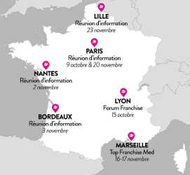 Elles débutent le 9 octobre, à Paris, le 15 octobre au Forum Franchise de Lyon, le 2 novembre à Nantes, le 3 novembre à Bordeaux, le 16 et 17 novembre au Top Franchise de Marseille, le 20 novembre à Paris et le 23 novembre à Lille.